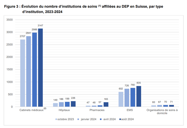 Les institutions de santé sont réparties entre celles qui sont légalement tenues de s’affilier au DEP (hôpitaux, établissements médico-sociaux (EMS) et cabinets médicaux nouvellement autorisés) et celles qui s’affilient volontairement (cabinets médicaux existants, pharmacies et organisations d’aide et de soins à domicile).